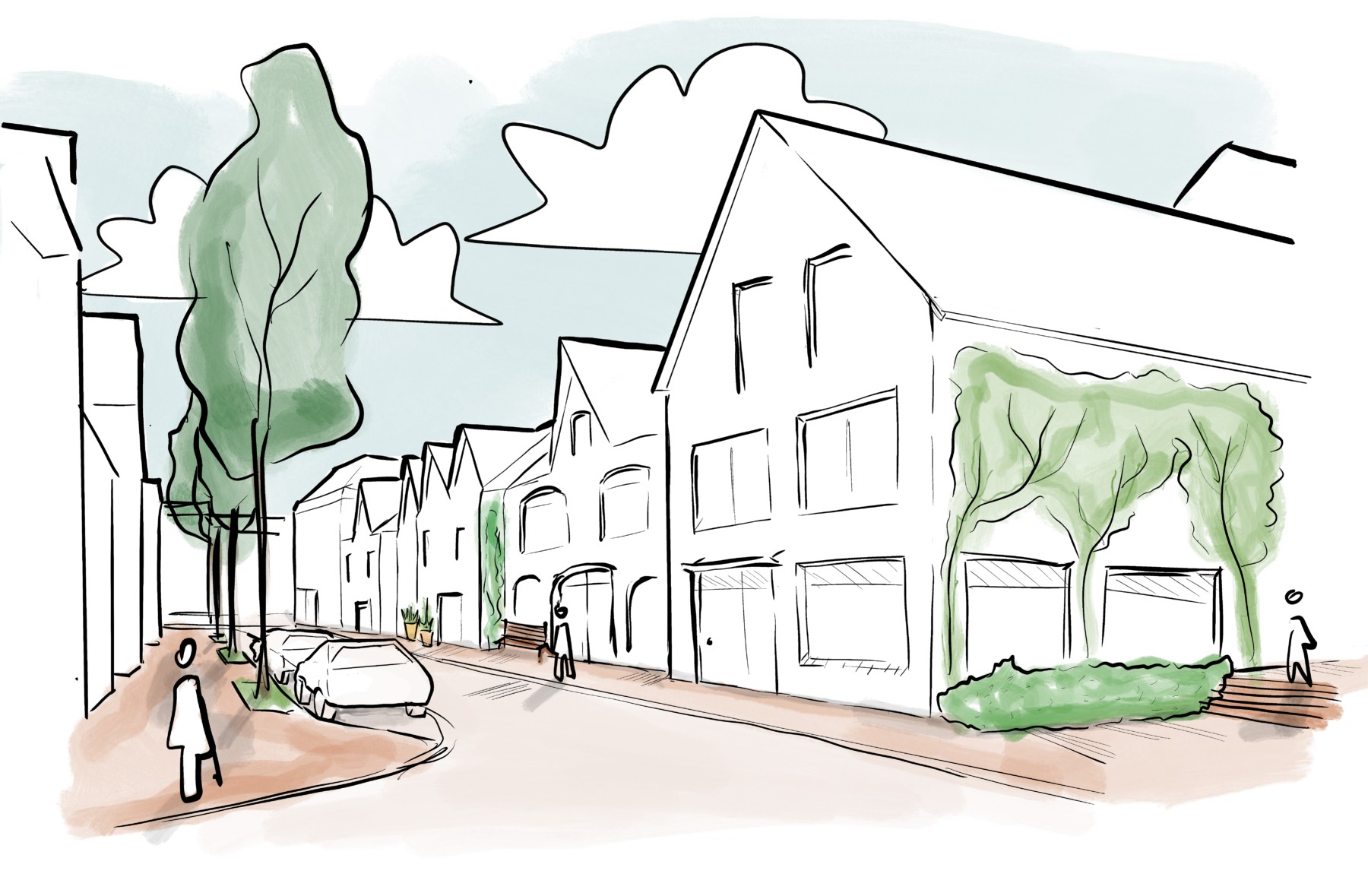 New buildings along the edges of the park frame the large park space and create a gradual transition between the park and the existing village. Variation in building heights, staggered building lines, and sightlines results in a lively and varied park environment. The buildings orient their front façades toward the park and provide space for amenities that support everyday use.