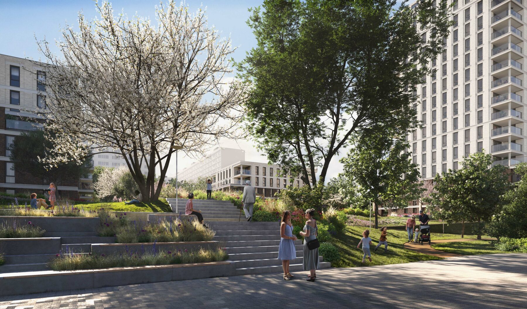 The green parking deck features gently sloping embankments and is easily accessible. It clearly acts as an extension of the existing park, thereby mitigating its somewhat isolated setting and creating an organic unity. This improved park is not only an asset for the new residents, but also provides that much-needed connection with the surrounding neighborhood. In this way, even more residents can enjoy this new, inclusive landscape.