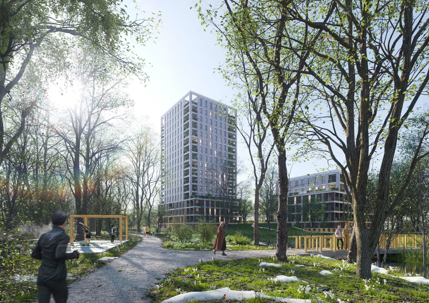 By introducing two pedestrian bridges, the existing green zone on the western side of the project area becomes an integral part of the whole in landscape, ecological, and recreational terms. This green zone is drawn into the project area by introducing natural banks and an ecological continuation through the (partly elevated) site. The landscape offers a carefully considered alternation of ‘open’ and ‘dense’, with both solitary and clustered trees, as well as continuous shrubbery. In this way, De Blinkert not only ensures visually appealing, seamless transitions between the project area and its surroundings, but also creates an ecological corridor that improves accessibility of green avenues, waterways, and green structures in the neighborhood for birds, small mammals, and amphibians. De Blinkert will become a fully integrated residential landscape for people, flora, and fauna, of high landscape quality.