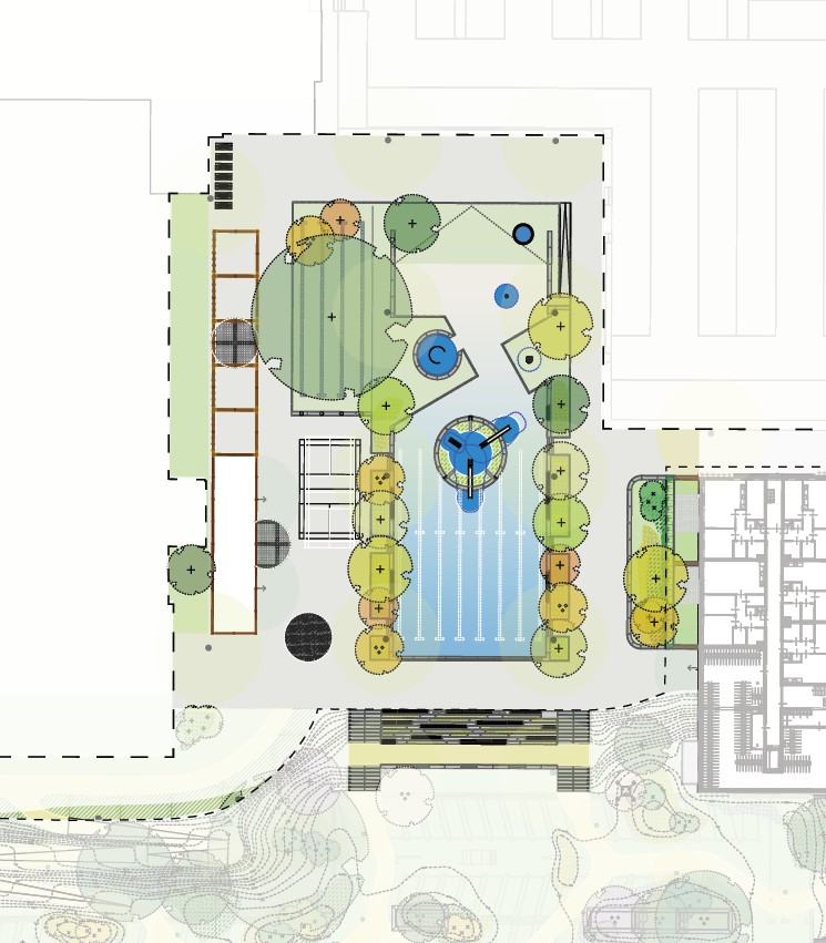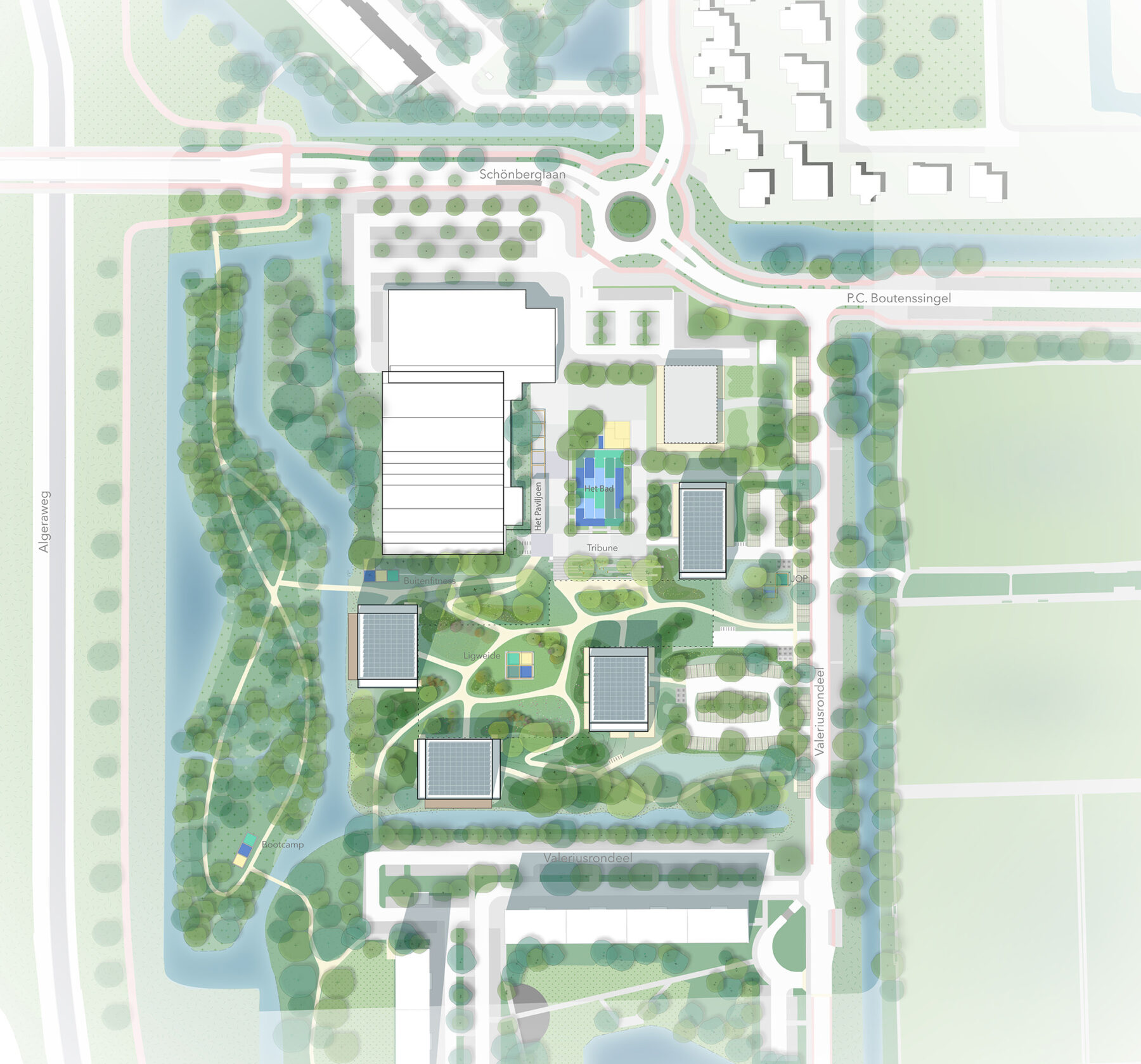 We introduce The Bath, a sunken square that refers to the former swimming pool, complete with a grandstand. In the adjacent Pavilion, you’ll find goals, hoops, balls, sticks, and other equipment, while the lines and surfaces in The Bath encourage different types of play and sport. Around The Bath are several smaller play areas, ranging from marbles to pétanque. In addition to this multifunctional open space, the area in and around the plan—together with the adjacent ecological zone—links various sports and recreational routes.