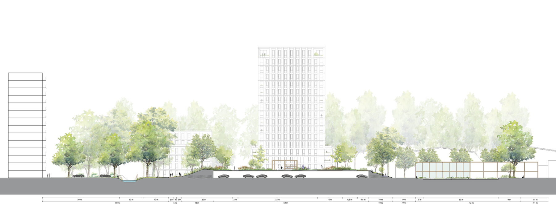 A crucial step is to place parking facilities not only out of sight but underground. On top of the deck, we add a green living environment with shrubs and small trees that can thrive on a thick layer of 80 centimeters of soil. With this green deck, we create a nature-inclusive space and natural water storage on the one hand, while significantly enhancing the livability and attractiveness of the area on the other.