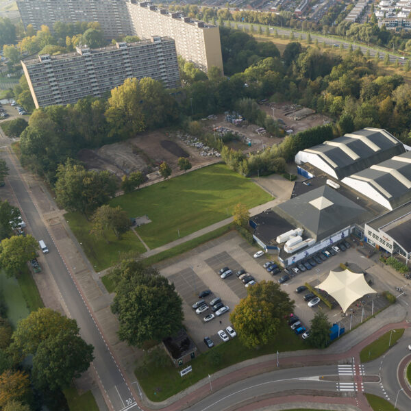 A large vacant site in a fairly complex and contrasting environment offers space for a new residential landscape with 180 homes. The design must take various factors into account. On one side of the area, there is a strong urban backdrop with large mid-20th-century housing blocks, while on the other side a more suburban atmosphere prevails. In addition, the site is bordered by a busy road and adjoins a somewhat secluded park. The field itself is home to a members-only sports club. The clubhouse forms a kind of island within the otherwise empty field and is oriented with its back turned toward it.