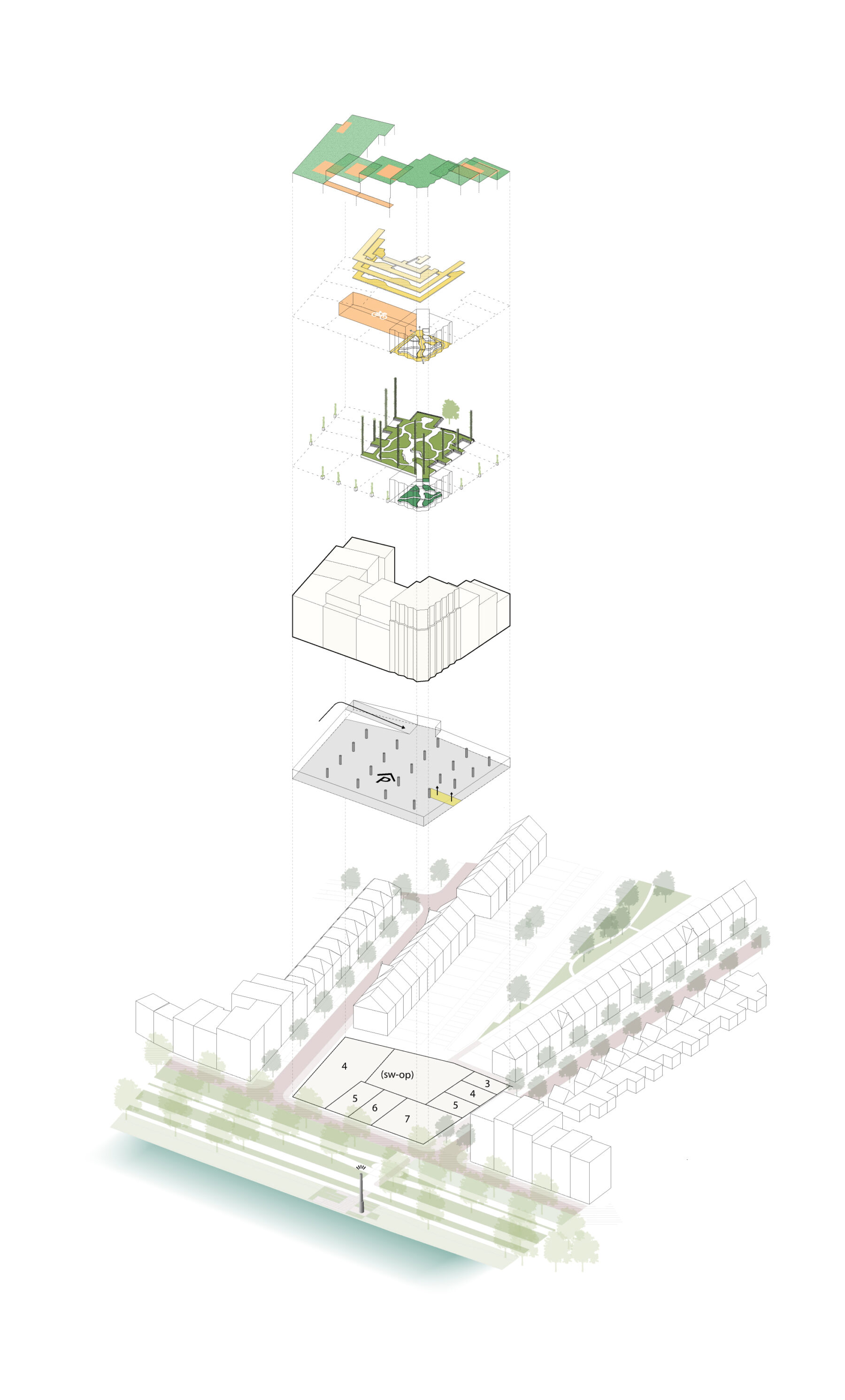 Een stelsel van collectieve ruimtes vormt de ruggengraat van het plan. De gebouwen zijn met elkaar verbonden via een netwerk van entrees, galerijen, binnentuinen en daken, waardoor een gelaagd en verweven woonmilieu ontstaat. De plinten zijn open en transparant vormgegeven, met directe relaties tussen woningen en straat, waardoor het dagelijks leven zichtbaar wordt en de interactie met de openbare ruimte wordt versterkt.