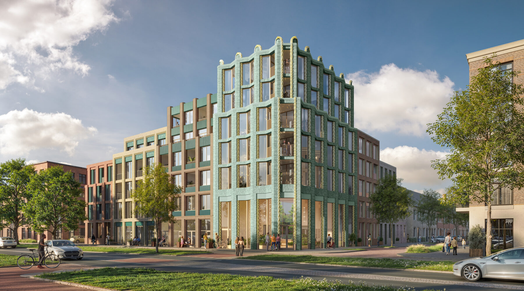 De levendige plinten, woningen aan de straat en informele overgangszones zoals Delftse stoepen dragen bij aan een actief straatbeeld en versterken de relatie tussen gebouw en stad. Zo ontstaat een woonomgeving waarin ontmoeting, dagelijks gebruik en stedelijke levendigheid samenkomen.