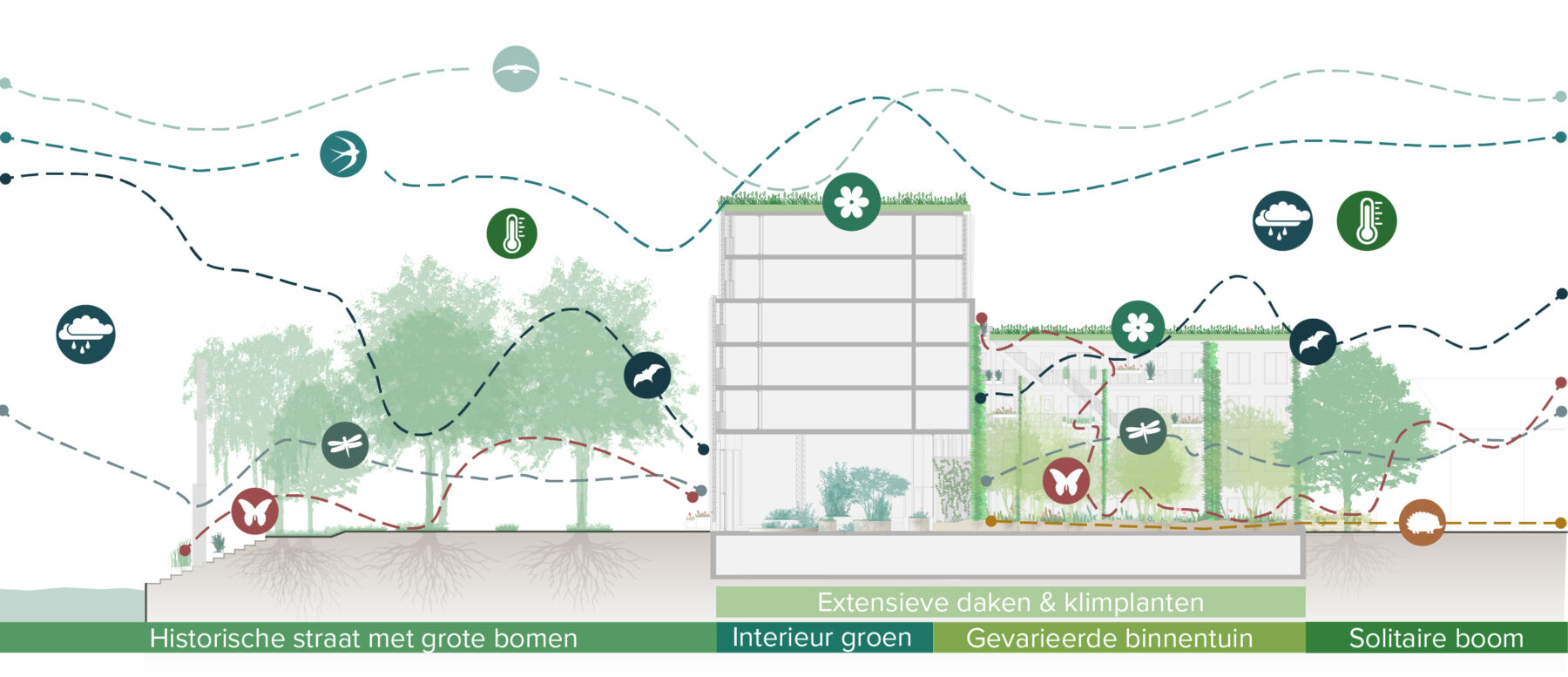 De groene binnentuin en daken dragen bij aan biodiversiteit en verkoeling. Met een rijk beplantingsplan en geïntegreerde nest- en verblijfplaatsen voor dieren ontstaat een natuurinclusieve leefomgeving die aansluit op de ecologische structuur van de omgeving.