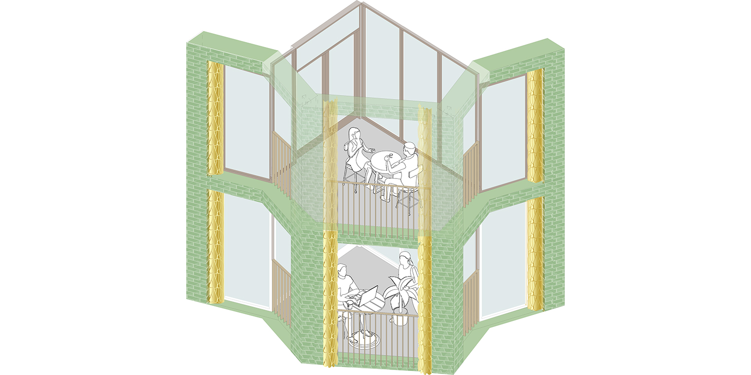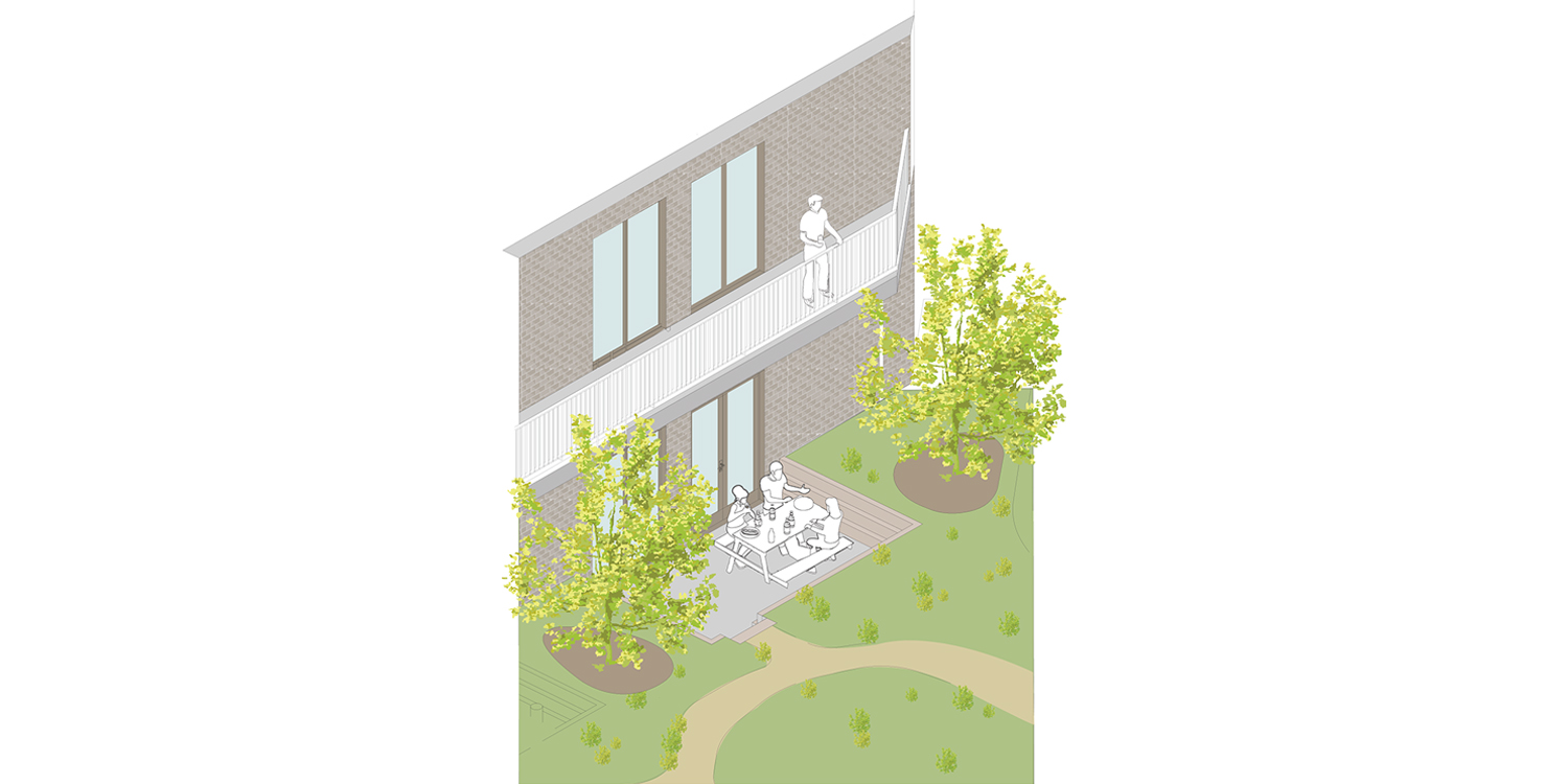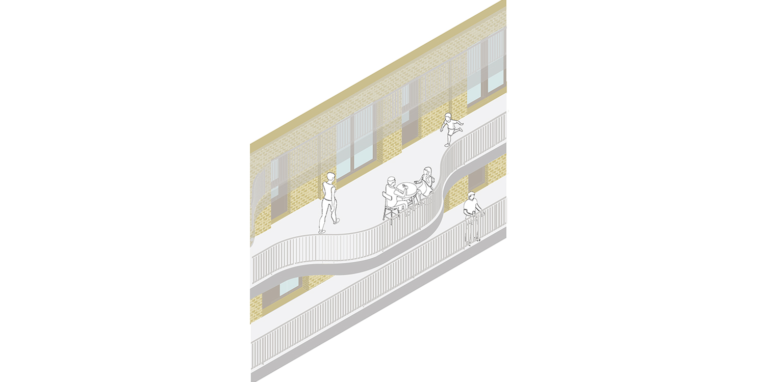 Het ontwerp stimuleert sociale interactie door een zorgvuldig netwerk van collectieve ruimtes. De centrale entree met collectieve woonkamer, de groene binnentuin, de galerijen en de gezamenlijke fietsenstalling vormen plekken waar bewoners elkaar vanzelf ontmoeten. Tegelijkertijd bieden de woningen en buitenruimtes voldoende privacy en rust.