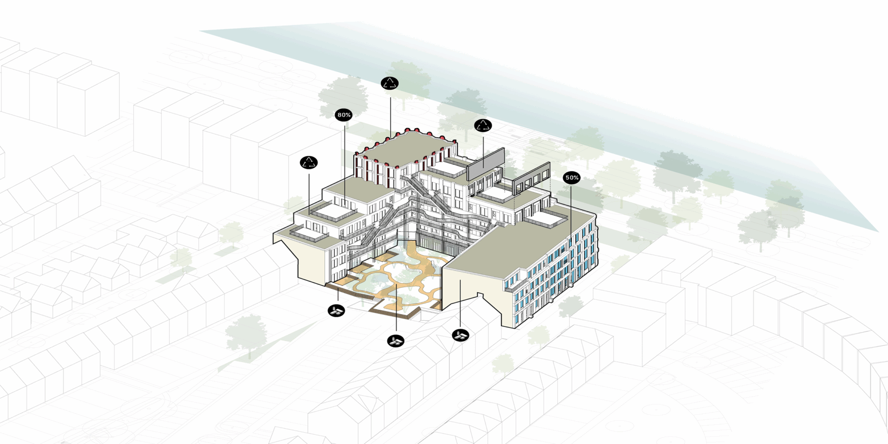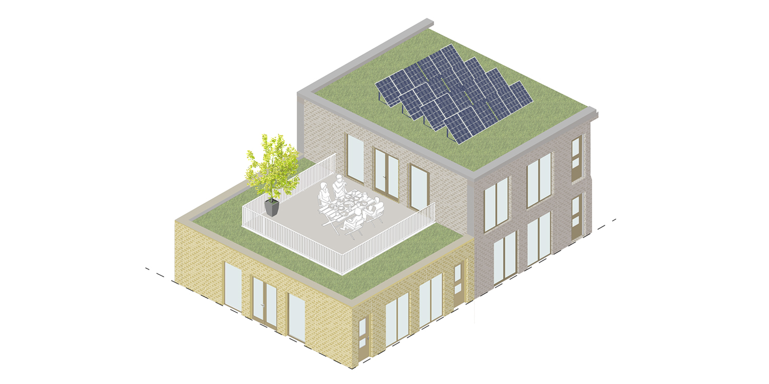 De gebouwen worden voorzien van hoogwaardige isolatie, groene daken, warmtepompen en zonnepanelen, waarmee minimaal energielabel A+++ wordt gerealiseerd. Regenwater wordt lokaal opgevangen, gebufferd en hergebruikt voor beplanting, waardoor het plan bijdraagt aan een robuust en klimaatadaptief watersysteem. Ook op materiaalniveau is sterk ingezet op circulariteit. Toepassing van biobased materialen zoals hennepisolatie, circulaire bakstenen en herbruikbare bouwcomponenten zorgt voor een hoge mate van hergebruik en een lage milieubelasting.
