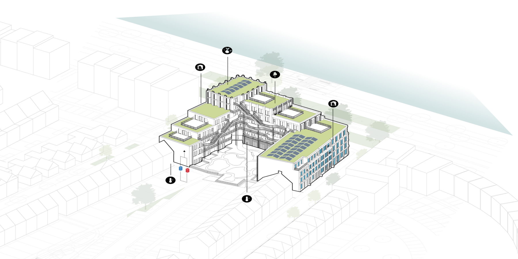 Een stelsel van collectieve ruimtes vormt de ruggengraat van het plan. De gebouwen zijn met elkaar verbonden via een netwerk van entrees, galerijen, binnentuinen en daken, waardoor een gelaagd en verweven woonmilieu ontstaat. De plinten zijn open en transparant vormgegeven, met directe relaties tussen woningen en straat, waardoor het dagelijks leven zichtbaar wordt en de interactie met de openbare ruimte wordt versterkt.