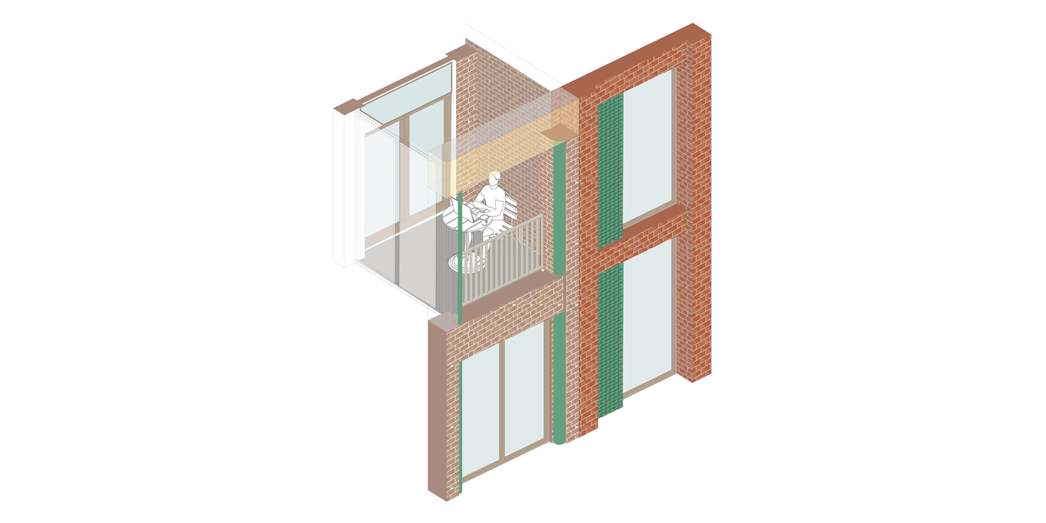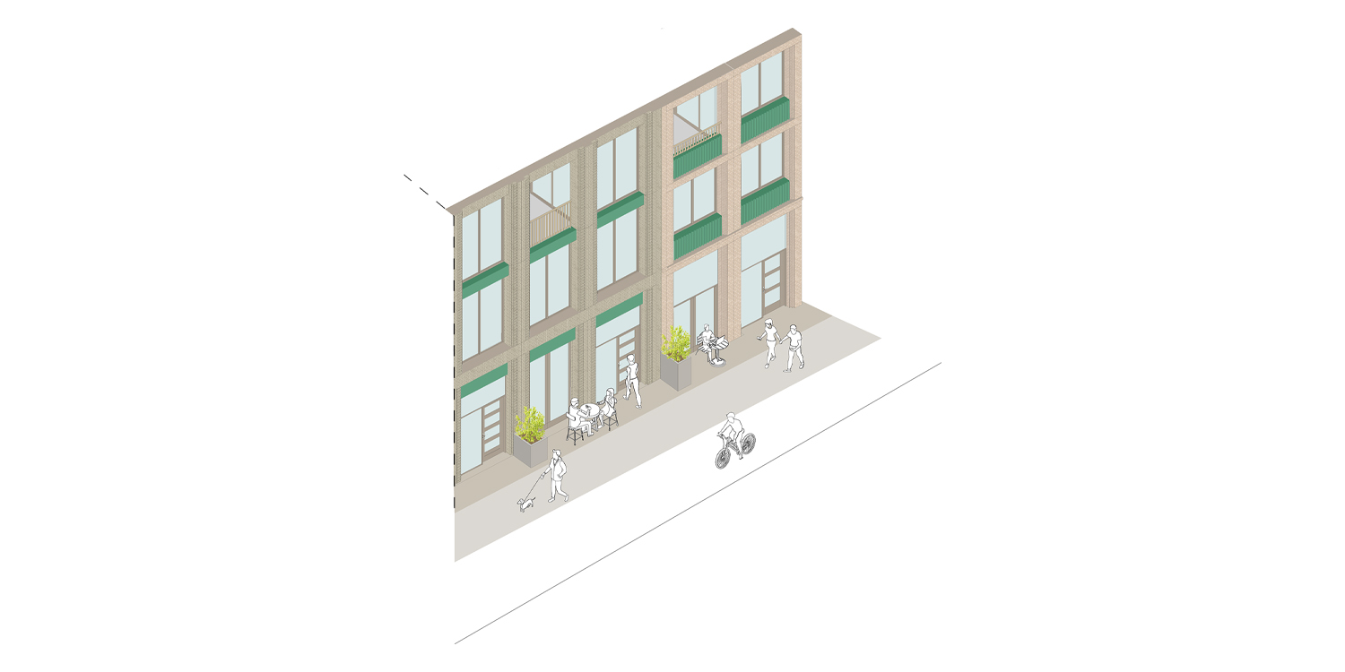 De levendige plinten, woningen aan de straat en informele overgangszones zoals Delftse stoepen dragen bij aan een actief straatbeeld en versterken de relatie tussen gebouw en stad. Zo ontstaat een woonomgeving waarin ontmoeting, dagelijks gebruik en stedelijke levendigheid samenkomen.